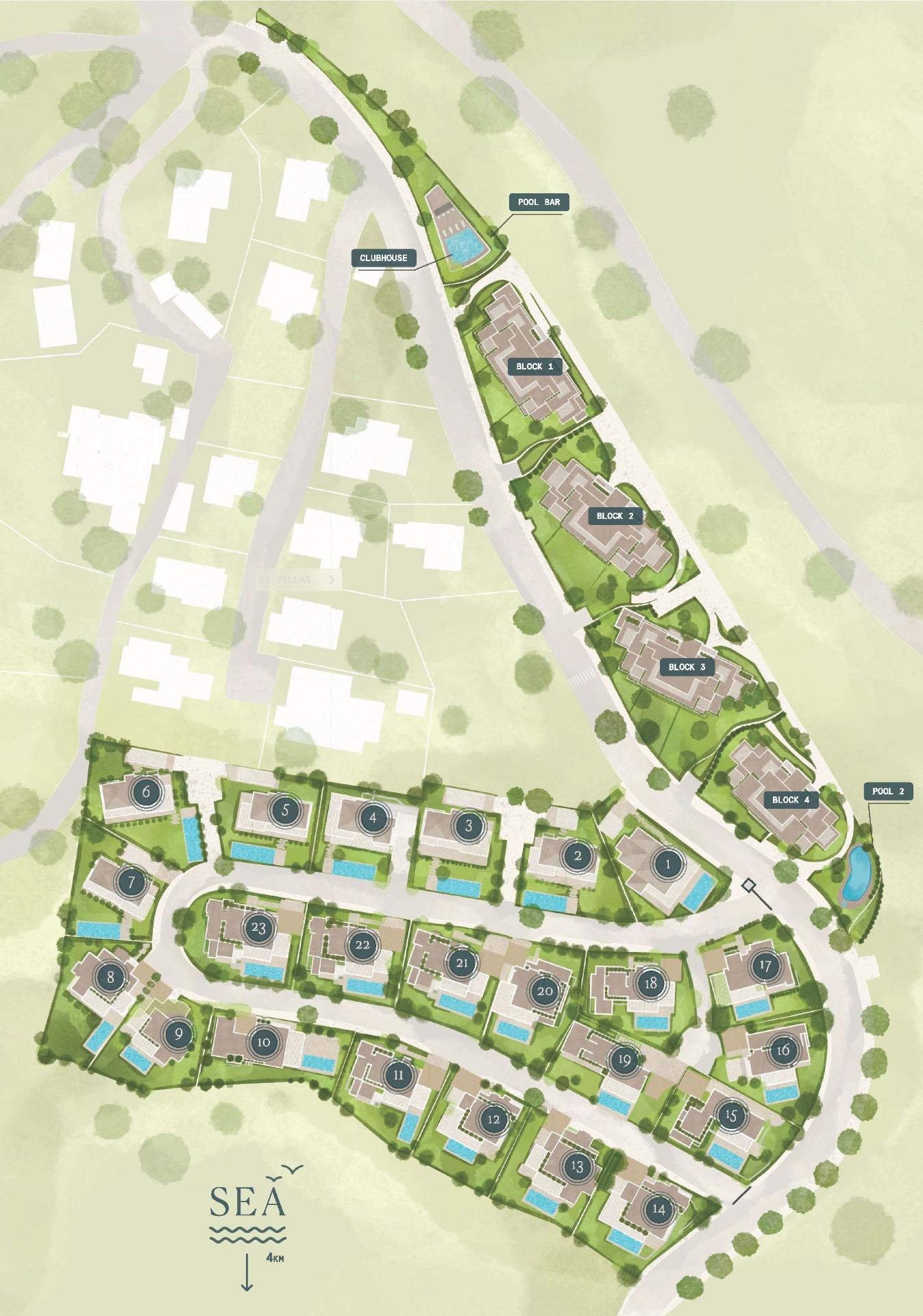 - Wille: Przestronne układy z 4, 5 lub 6 sypialniami, prywatnymi basenami, bujnymi ogrodami i opcjami jednej lub dwóch kondygnacji naziemnych. Każda willa obejmuje podziemną przestrzeń dla dodatkowej funkcjonalności.